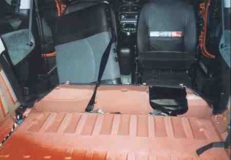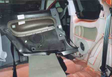 Ich habe erstmal die hintere Sitzbank und Seitenverkleidung soweit es ging ausgebaut um hier alles zu dämmen und später die Kabel durch den Innenraum verlegen zu können. Die hinteren Originallautsprecher habe ich drin gelassen, sie werden über das Radio mit Signalen versorgt. | |