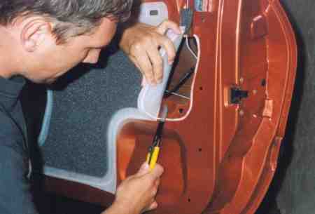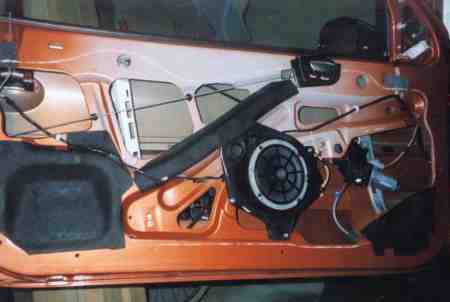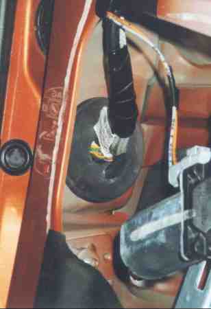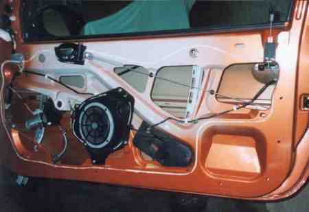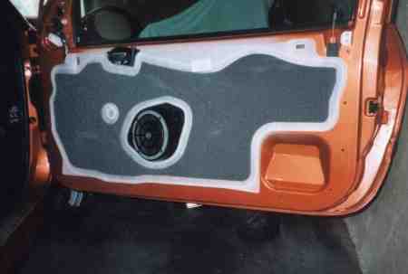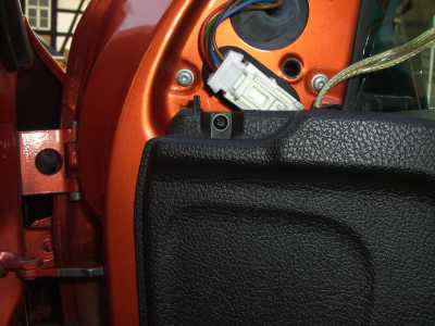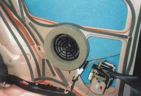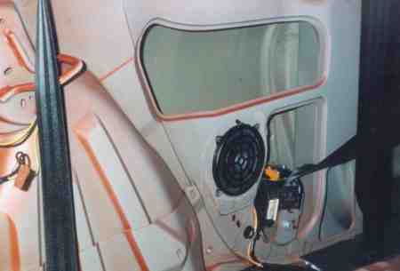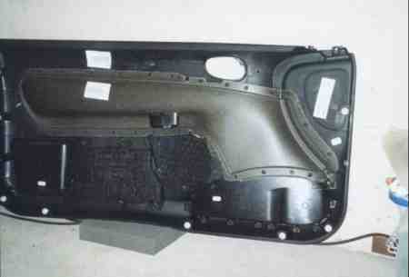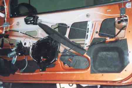 Nun kann noch die Türverkleidung gedämmt werden. Danach habe ich die Lautsprecherkabel unterhalb der Originaldurchführung durch die Gummiabdeckung gezogen und sie mit Schrumpfschlauch geschützt. In der Tür kann man Sie an den Originalkabeln entlang legen. | |