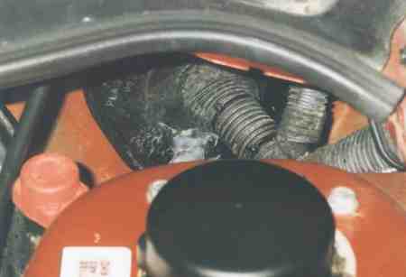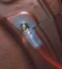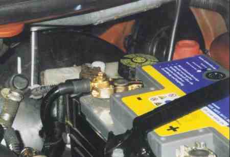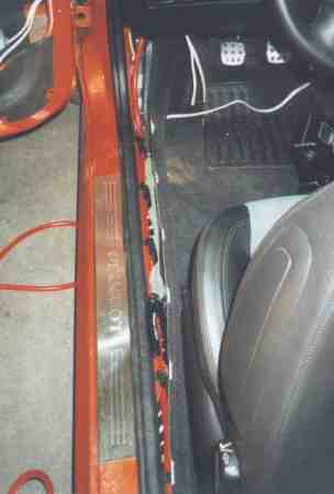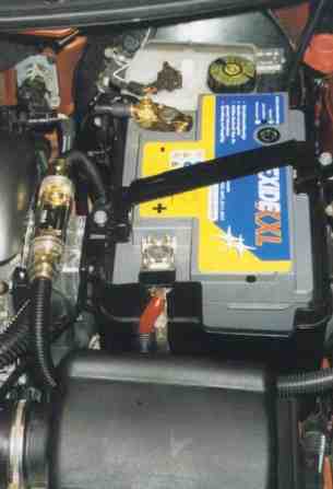 Als nächstes habe ich mich der Stromversorgung gewidmet. Das Pluskabel habe ich an den Original- Schnappverschluß an gelötet. Das Massekabel um ein weiteres ergänzt. Die Hauptsicherung kam neben der Batterie auf einen Aluwinkel, den ich dort gut anschrauben konnte. Als Durchführung in den Innenraum kann man unterhalb der Kabelbaumdurchführung einen Blindstopfen entfernen und erhält ein wunderbares Loch zum durchfädeln des Pluskabels. Das ganze dann noch mit Silikon abgedichtet - fertig. Im Fahrzeuginnenraum gings dann im Fußraum der Fahrerseite entlang in den Kofferraum. | |