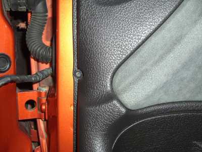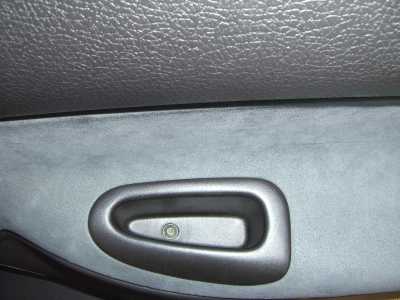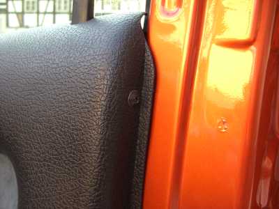 Die Verkleidung ist mit 4 Schrauben und einigen Klippsen befestigt. Eine davon befindet sich hinter dem Spiegeldreieck (vorsichtig abnehen damit die Plastestifte nicht abbrechen!!!), eine in der Griffmulde und jeweils eine rechts und links. Die Plasteabdeckung um den Türgriff muß auch noch herrausgehebelt werden, er ist eingeschnappt. Untenrum ist die Verkleidung geklippst, mit einem beherzten Ruck abziehen und dann komplett nach oben heben und abnehmen. (siehe Fotos) | |