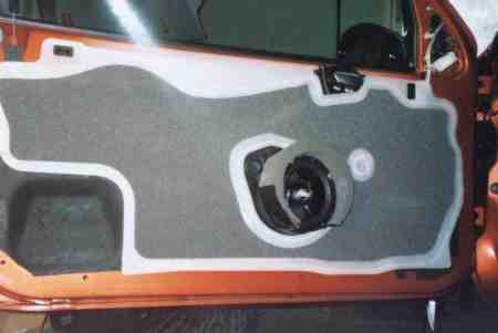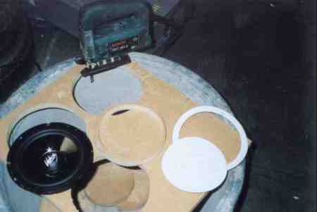 Diese Distanzringe sägte ich mir aus einer 19er MDF Platte aus und schraubte die Woofer in die Einbauplätze. Damit zwischen der Schallöffnung der Türverkleidung und den Woofern direkter Kontakt besteht (Vorsicht! akustischer Kurzschluss) gabs noch einen Schaumstoffring zur Abdichtung. | |