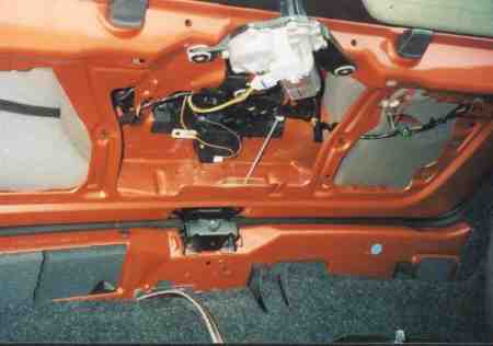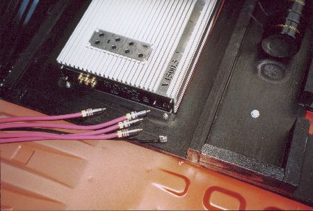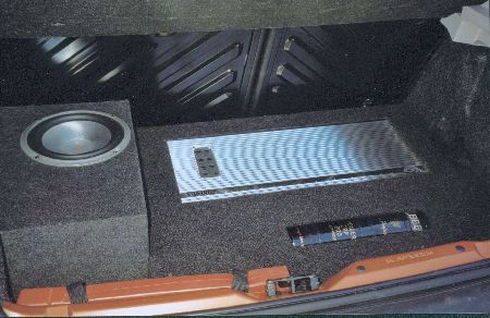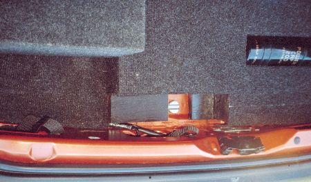 Der Pufferkondensatur bekam eine eigens konstruierte Halterung aus Kabelbindern und einer Schaumstoffunterlage. Danach kam eine Deckplatte auf die Kofferraumkonstruktion mit Ausschnitte für den Verstärker und den Kondensator. Außerdem habe ich bei der Konstruktion Platz für die Halterschraube des Reseverades gelassen. | |