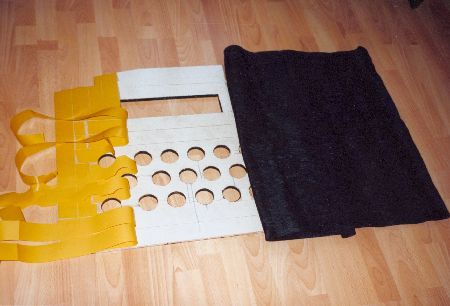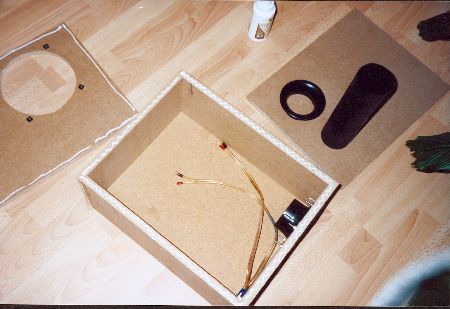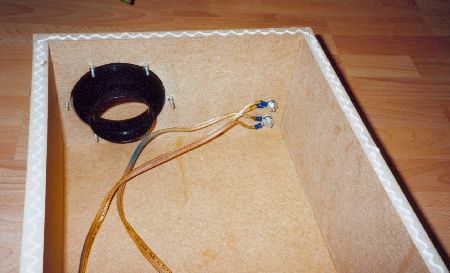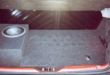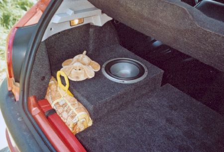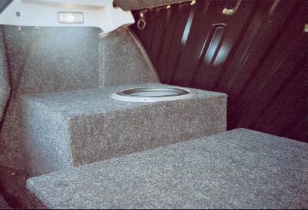 Für meinen 20er Subwoofer von Rainbow baute ich natürlich noch ein passendes Bassreflexgehäuse. Dieses bezog ich, wie auch die Deckplatte und die Kofferaumabdeckung mit Stoff in antrazit. | |