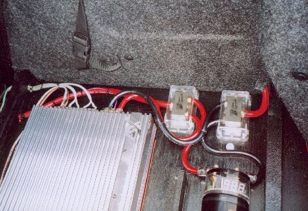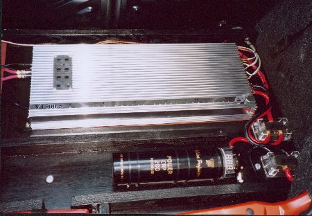 Auf eine schwarz lackierte Grundplatte montierte ich meinen 5-Kanalverstärker ESX Vision V1500.5, einen 2 Farad Pufferkondensator von AIV und die Stromverteilung. Ein 35 mm² Pluskabel bis zum Verteilerblock und dann jeweils 25 mm² zum Kondi und zum Verstärker. Das Massekabel von der Kofferraumseitenwand verteilte ich genauso. | |