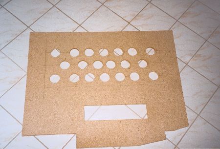 Den Stoff befestigte ich mit doppelseitigen Klebeband auf der mit Lüftungslöchern für den Verstärker und einen Sichtschlitz für die Spannungsanzeige des Pufferkondensator versehenen Abdeckplatte. Fertig eingebaut ergibt das ein sauberes Bild! | |